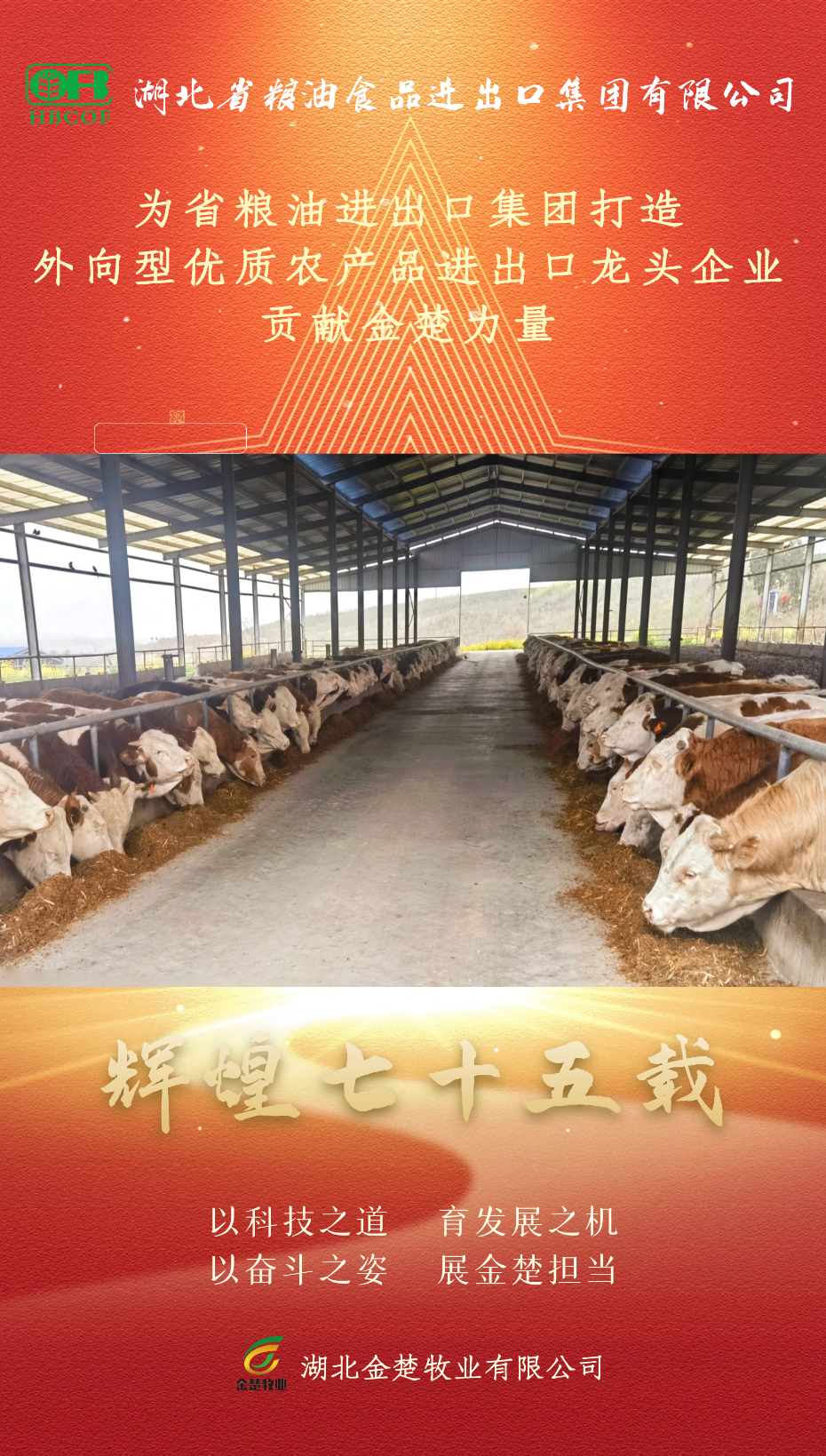 75年櫛風沐雨,75年滄桑巨變,是祖國披荊斬棘、勇往直前的75年,也是省糧油進出口集團艱苦奮斗、干事創業的75年,不僅是對過去成就的見證,更是未來發展的新起點。金楚公司將勇立潮頭、展望未來,以開拓創新的膽識魄力,鍥而不舍的執著干勁,篤行不怠譜華章,奮楫揚帆建新功,為省糧油進出口集團打造外向型優質農產品進出口龍頭企業而努力前行,為湖北農發集團開創高質量發展新局面而不懈奮斗!