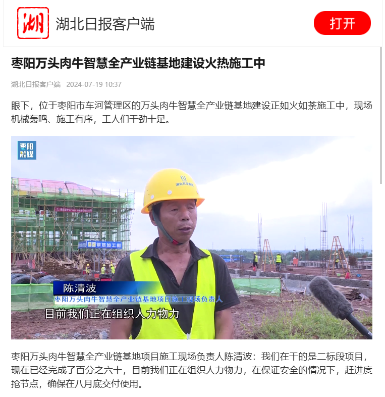 湖北日?qǐng)?bào):棗陽萬頭肉牛智慧全產(chǎn)業(yè)鏈基地建設(shè)火熱施工中
