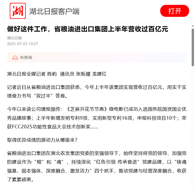 湖北日報:做好這件工作,省糧油進出口集團上半年營收過百億元