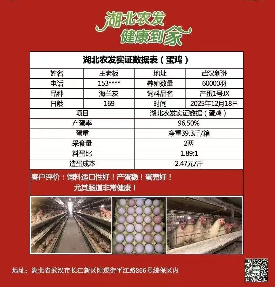 湖北農(nóng)發(fā)集團(tuán)旗下省糧油進(jìn)出口集團(tuán)湖北農(nóng)發(fā)生物科技有限公司(以下簡(jiǎn)稱:農(nóng)發(fā)生物科技)坐落于長(zhǎng)江新區(qū)武漢新港陽(yáng)邏綜合保稅區(qū),依托陽(yáng)邏港區(qū)位優(yōu)勢(shì)打造優(yōu)質(zhì)飼料供給體系,農(nóng)嘉豐?系列“產(chǎn)蛋1號(hào)”飼料,在武漢新洲蛋雞養(yǎng)殖現(xiàn)場(chǎng)交出亮眼答卷:其6萬(wàn)羽169日齡海蘭灰蛋雞,產(chǎn)蛋率達(dá) 96.50%,每箱蛋凈重 39.3 斤,料蛋比 1.89:1,造蛋成本僅 2.47 元 / 斤,實(shí)效獲養(yǎng)殖戶認(rèn)可。